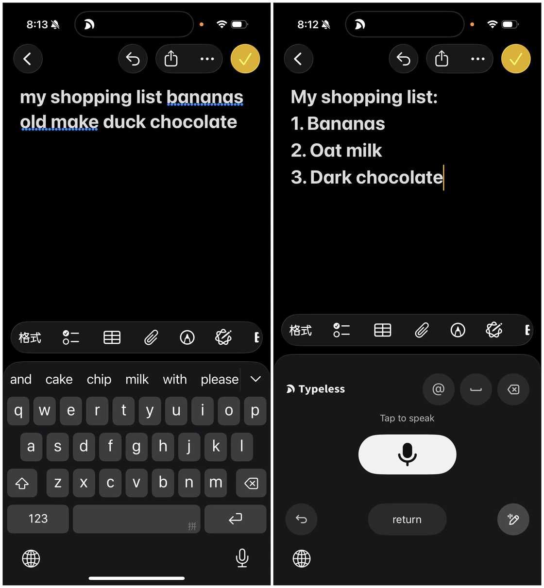 Typeless 支持对语音输入的内容进行自动排版。当我们通过 Typeless 进行语音输入的内容包含多个要点,或者包含一些清单、排列内容时,Typeless 会自动对内容进行排版,以更加清晰直观的样式来表达。同样举个例子,当我对 Typeless 说「My Shopping List, Bananas, Oat Milk, Dark Chocolate」时,Typeless 就会自动输出排版后的内容。
