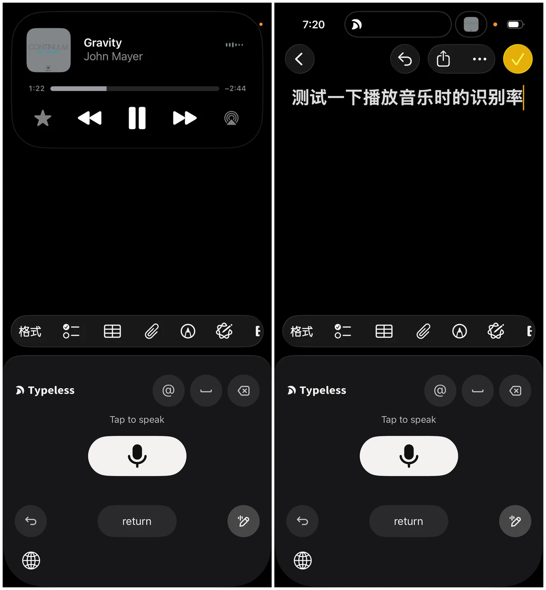 除此之外,当我在 iPhone 上戴着 AirPods 听歌的时候,我也可以使用 Typeless 进行语音输入,既不会打断原来的歌曲播放,也不会被歌曲播放的声音所影响。