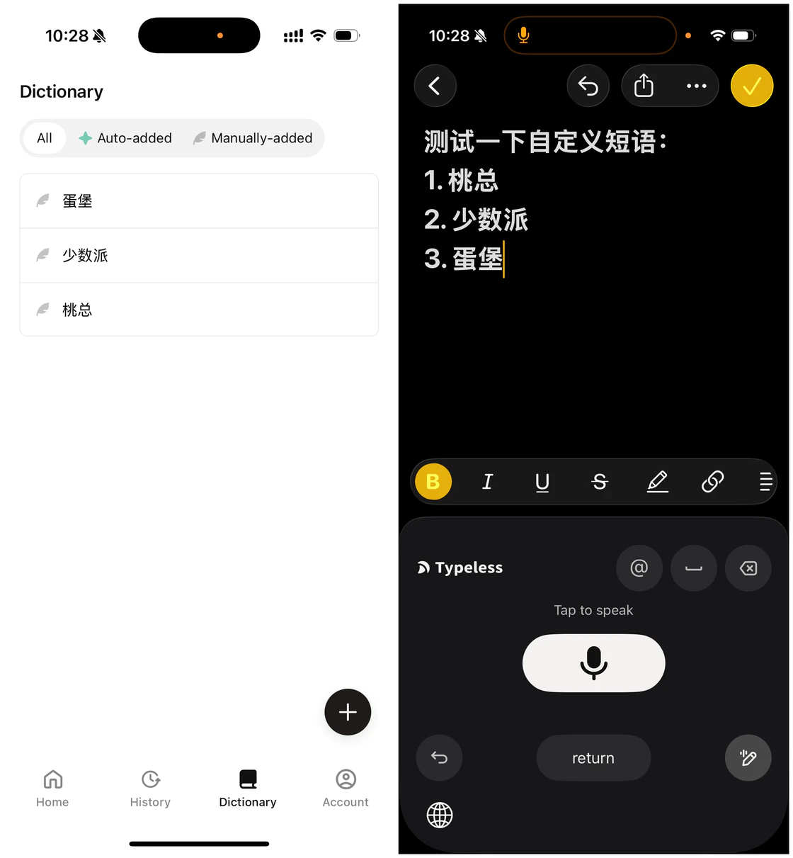 最后,Typeless 提供了词典功能,让语音输入更加准确和个性化。我们可以通过手动创建,或者通过语音重新编辑来创建自己专属的词典条目。创建完成后,Typeless 在后续输入这些词条时,就可以实现精准匹配以及相应的输入,让这些生僻词或者专有名词完全对应你的预设内容,避免重复修改的麻烦。