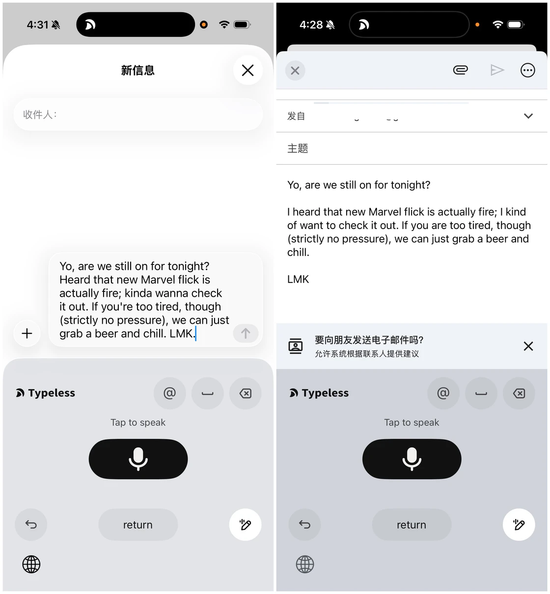 Typeless 可以针对不同的场景提供相应的语气改写和词汇匹配。以下面这段话为例:「Yo! Are we still on for tonight? Heard that new marvel flick is actually fire, kinda wanna check it out.If you’re too tired tho strictly no pressure, we can just grab a beer and chill. Lmk!」当我在短信 App 和 Gmail App 中分别通过 Typeless 进行语音输入时,出现了一些明显的差异。在短信 App 中,「kinda wanna」这样口语化的表达被完整保留,而在 Gmail App 中,「kinda wanna」被修改为了更加书面化的「I kind of want to」。另外,像「tho」这样非常简略的表达也在两个 App 中都被改写成为了完整的「though」。