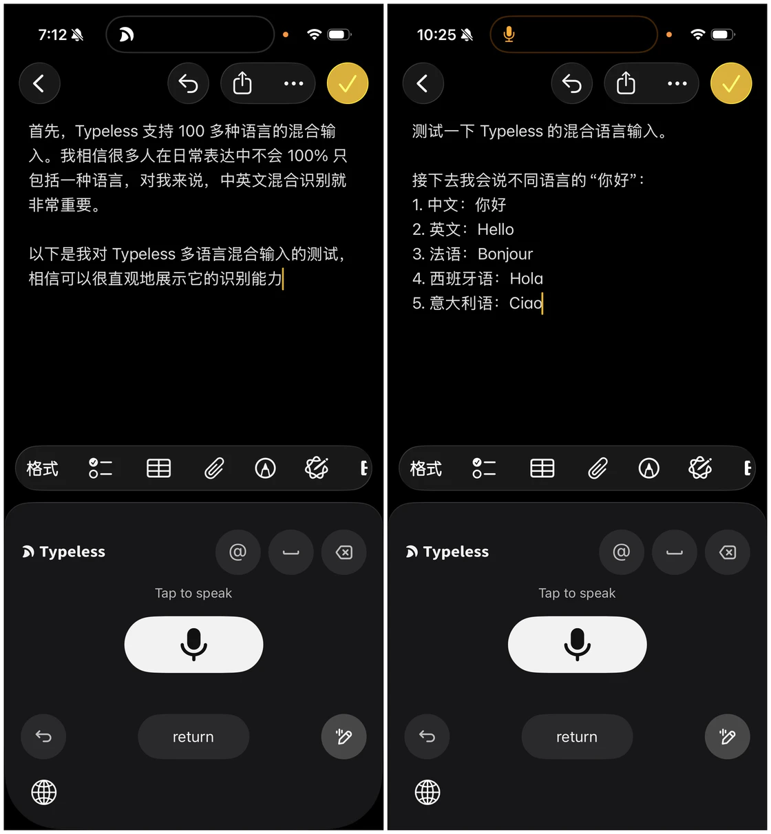 首先,Typeless 支持 100 多种语言的混合输入。我相信很多人在日常表达中不会 100% 只包括一种语言,对我来说中英文混合识别就非常重要。以下是我对 Typeless 多语言混合输入的测试,相信可以很直观地展示它的识别能力。