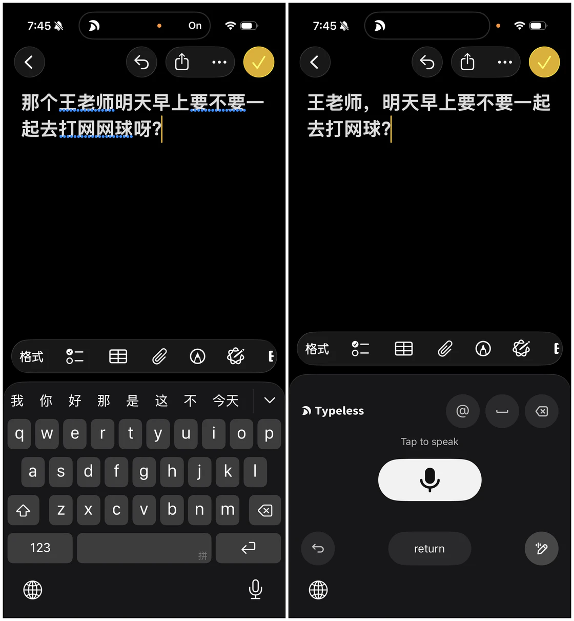 Typeless 支持在语音输入时进行实时编辑。如开头提到的,大部分语音输入法致力于还原口述者的所有语音输入,但是当口述者改变了主意或者口误时,无法进行修改。Typeless 则支持口述者在进行语音输入时对之前的表述进行修改,Typeless 会对相应的部分自动完成纠正。举个例子,当我说「明天上午 9 点打算去医院打点滴,感觉身体不太舒服,啊不对,还是明天下午 3 点去吧」,Typeless 会自动将内容修改为:「明天下午 3 点打算去医院打点滴,感觉身体不太舒服」。